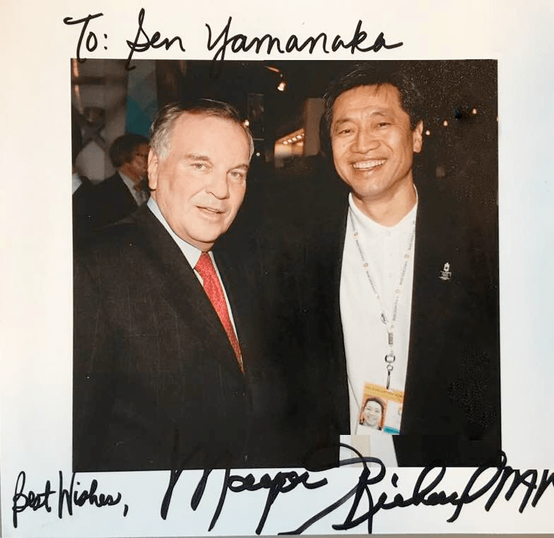 (写真は、当時のシカゴ市リチャード・デイリー市長と国際オリンピック委員会(IOC)の”都市選定委員会”を迎えての歓迎セレモニーで)