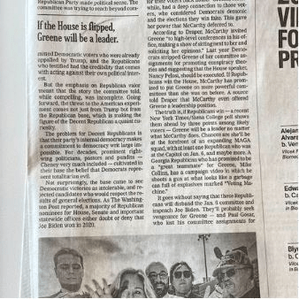 その中で、親バイデン御本家新聞のニューヨーク・タイムズ紙は10月18日コラムで、下院が共和党に奪還された後、共和党院内総務のケヴィン・マカーシーは、新たに下院のリーダーとしてもっともトランプを強力に支援している下院議員マージョリー・テイラー・グリーン(MTG)をリーダーの座に起用することになると予想している。