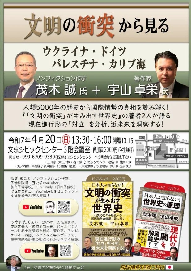 4月20日(日)茂木誠さんと宇山卓栄さんの講演会 4月20日(日)13:30-16:00 文京シビックセンターで、茂木誠さんと宇山卓栄さんの講演会が行われます。 私も参加予定です。 お二人の新刊書も拝読するのを楽しみにしています。 まだ若干席はありそうとのこと。 滅多に聞けないお二人のユニークな歴史史観を聞けるチャンス。 ぜひおいで下さい。 佐藤和夫 オリジナル投稿 · 会場はシビックセンター3階会議室です。 お間違えないようお気を付け下さい。 共有: X で共有 (新しいウィンドウで開きます) X Facebook で共有 (新しいウィンドウで開きます) Facebook いいね 読み込み中… 関連 未分類